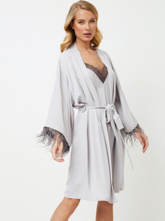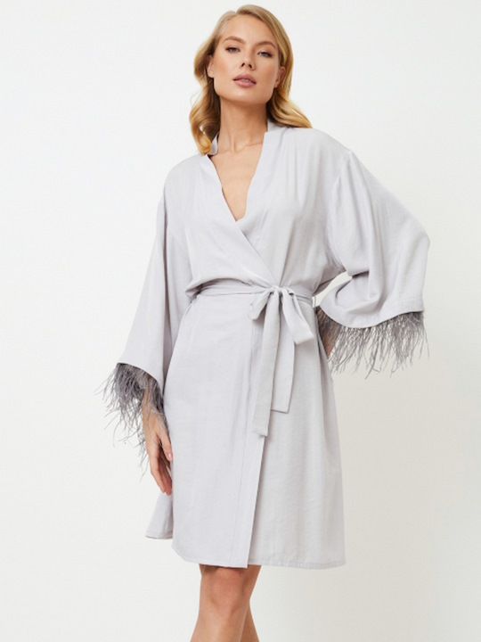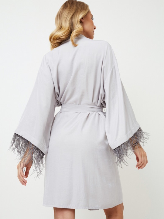 Шикарно и великолепно...не требуется больше слов… Платье Brigitte выполнено из очень мягкой ткани нежно-серого цвета с эффектом шелка. Платье украшено съемными перьями более темного цвета на манжетах и завязывается поясом. Для удобства движений платье дополнительно завязано внутренними завязками. Его легко сочетать с нашей ночной рубашкой Brigitte!