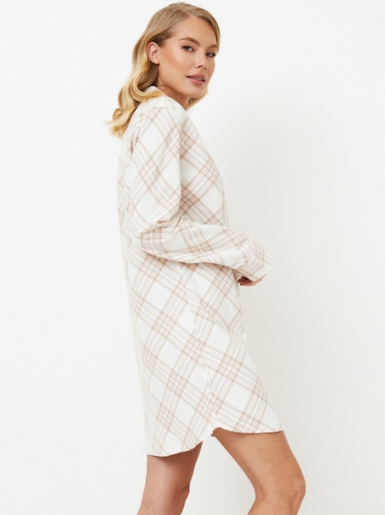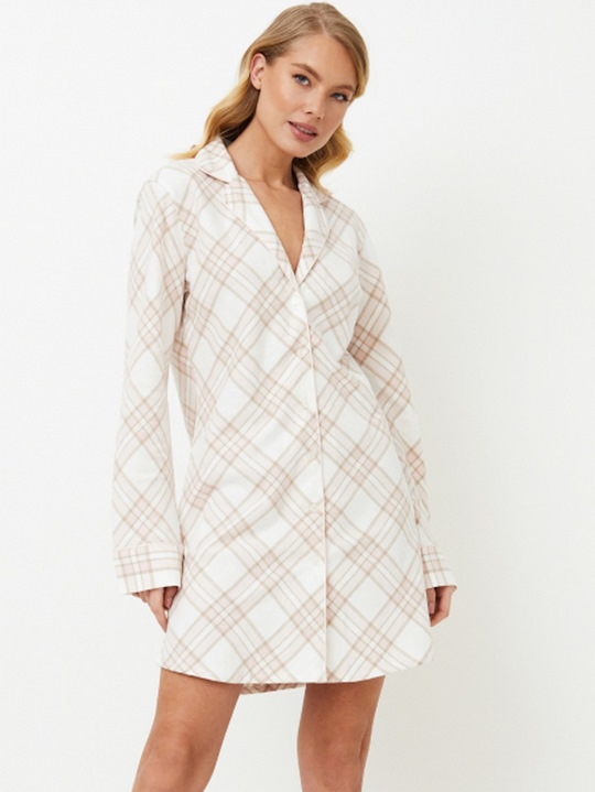 Ночная рубашка Camille - это вечная классика мягких оттенков. Ночная рубашка выполнена из мягкого хлопка в спокойную белую, бежевую и розовую клетку. Платье на пуговицах с длинными рукавами, V-образным вырезом горловины, окантовкой по вороту и манжетам рукавов и изящной вышивкой "Мечта" на задней стороне воротника придают ему утонченную элегантность. Наденьте ночную рубашку Camille для спокойного и стильного ночного отдыха. Изделие выполнено из хлопкового фланеля.