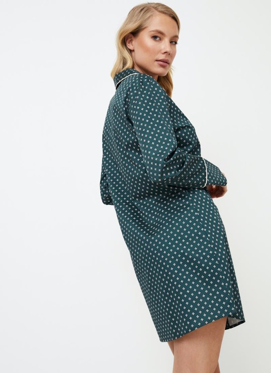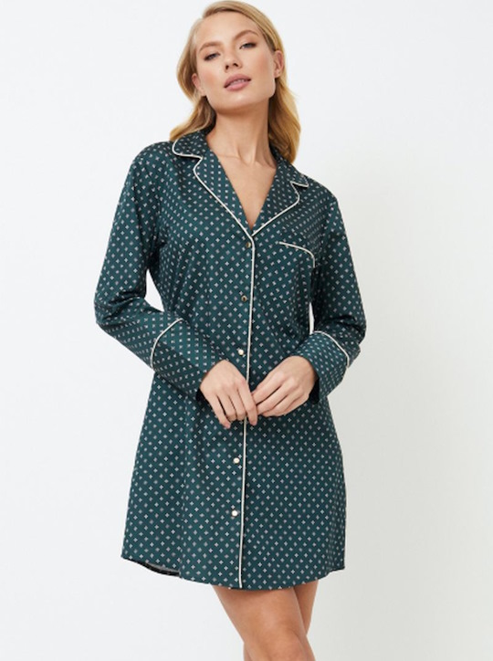 Представляем ночную рубашку Genny, великолепный выбор для вашего ночного комфорта. Платье сшито из блестящей хлопчатобумажной ткани изумрудно-зеленого цвета с роскошным геометрическим рисунком. Ночная рубашка на пуговицах с длинными рукавами, V-образным вырезом горловины, нагрудным карманом, золотыми пуговицами и окантовкой по вороту, передней части и манжетам рукавов. Сочетайте ее с пижамой Gabriel pajama long, чтобы создать идеальный комплект, идеально подходящий для уютных вечеров с любимым человеком. Украсьте свой образ перед сном с помощью ночной рубашки Genny! Изделие выполнено из шелковистого текстильного хлопка.