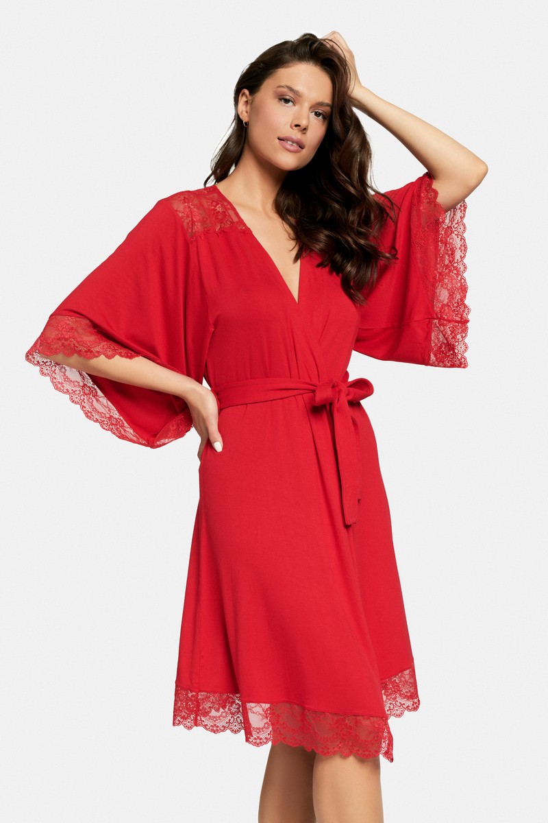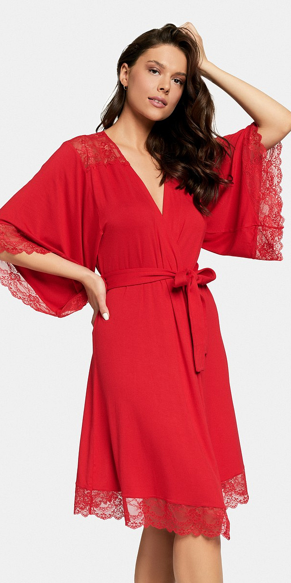 Нежный вискозный халат FUNNY от европейского производителя Esotiq. Изделие с поясом, на запахе, декорировано цветочным кружевом. Укороченный широкий рукав, спинка частично прошита совместно с поясом с драпировкой ткани.
