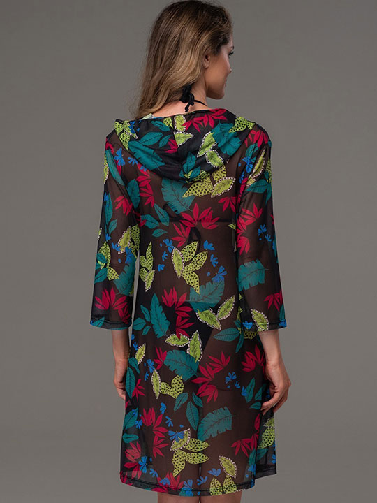Туника средней длины Mia-Amore полуприлегающего силуэта с рукавами длиной 3/4 и капюшоном выполнена из тонкой гигроскопичной мягкой принтованной сетки. Горловина спереди регулируется завязками.