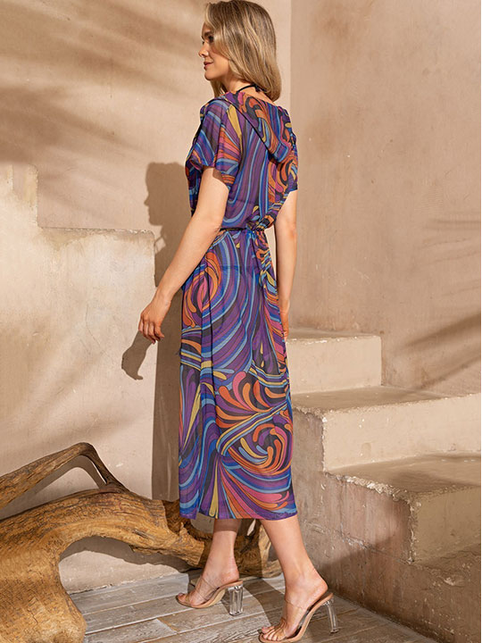 Длинная пляжная туника Mia-Amore с капюшоном и коротким рукавом. Ширину по талии можно регулировать за счет кулисы. Изделие выполнено из принтованной эластичной сетки. По бокам расположены разрезы для свободы движения.