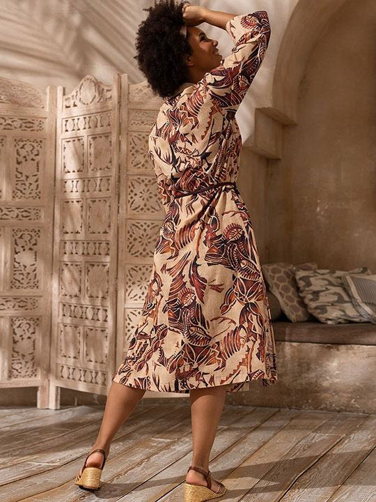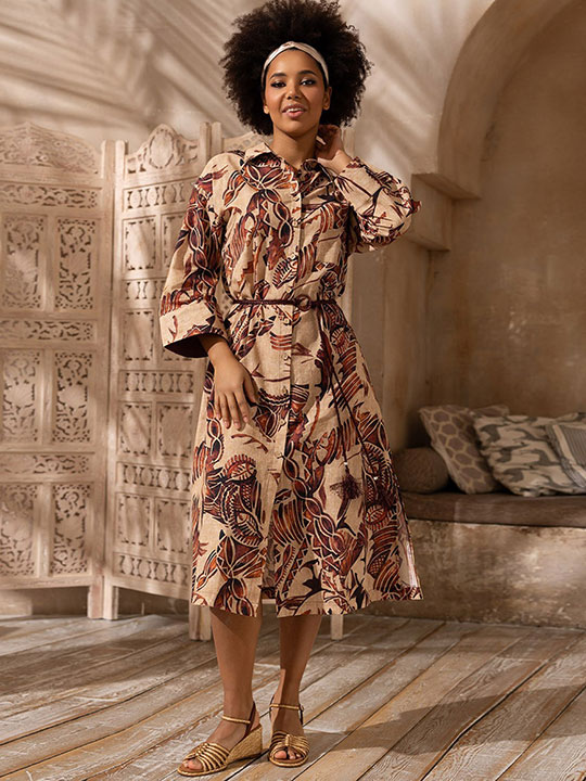 Длинная рубашка Mia-Amore свободного силуэта с рукавом длиной 3/4. Низ рукавов рубашки обработан манжетами, которые можно отвернуть и изменить длину рукава. По бокам расположены карманы, а по низу боковых швов обработаны разрезы для свободы движения. Узкий пояс с кистями идет в комплекте. Изделие выполнено из принтованного смесового хлопка.