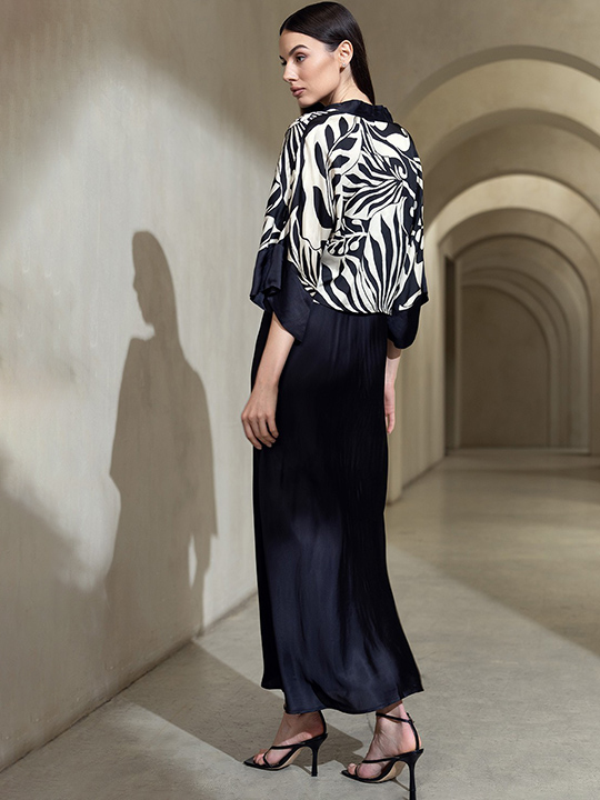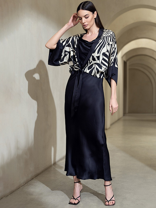 Комплект Mia-Amore состоит из принтованного жакета с широким длинным рукавом и однотонного длинного платья-комбинации на тонких бретелях. Изделия комплекта выполнены из смесового шелка.