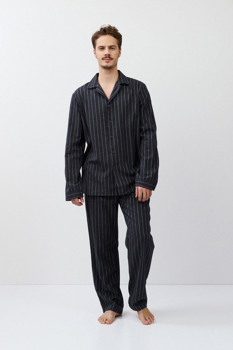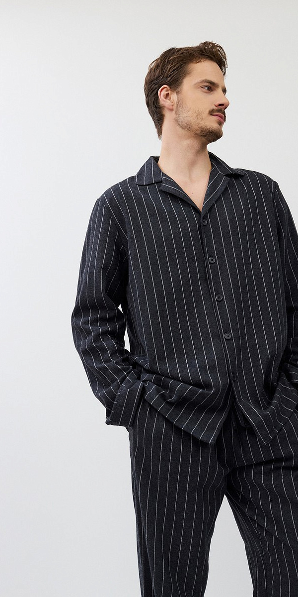 Пижама мужская со штанами CALEB для вашего ночного комфорта. Пижама выполнена из хлопковой фланели. Рубашка на пуговицах, с длинными рукавами, отложным воротником. Штаны длинные, свободной формы, с эластичным поясом с завязкой и боковыми карманами. Расслабьтесь с максимальным комфортом и стилем в пижаме CALEB.