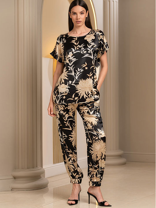 Комплект-двойка Mia-Amore состоит из топа со спущенными плечами и брюк с манжетами на резинке по низу, выполнен из принтованного смесового полотна. Брюки с поясом на резинке. В боковых швах брюк обработаны боковые карманы.