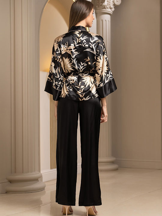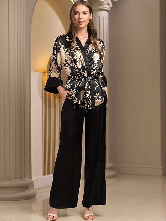Брючный комплект-тройка Mia-Amore состоит из жакета с длинным рукавом, топа на тонких бретелях и широких брюк. Комплект выполнен из принтованного смесового шелка с однотонной отделкой. Жакет и топ выполнены из принтованного смесового шелка с однотонной отделкой, а брюки – из однотонного смесового шелка. По бокам брюк обработаны карманы. Линию талии жакета можно подчеркнуть за счет пояса, который идет в комплекте.
