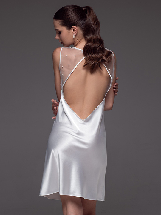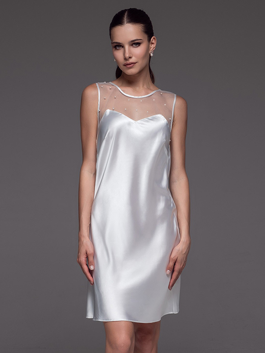 Короткая сорочка Mia-Amore выполнена из смесового шёлка, кокетка спереди и спинка сорочки украшена мягкой сеткой, декорированной искусственным жемчугом.