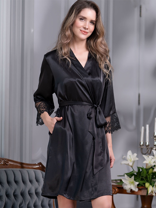 Короткий классический запашной халат Mia-Amore с рукавами длиной 3/4, выполнен из смесового однотонного шелка. Низ рукавов обработан французским кружевом, которое инкрустировано кристаллами Swarovski. По бокам расположены карманы.