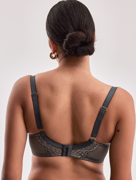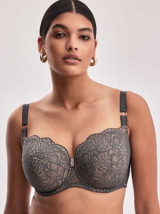 Бюстгальтер из коллекции Lusso PU с чашечками на косточках, с дополнительными боковыми поддержками, чашки шитые, нижняя часть из тонкого поролона телесного цвета, снаружи и верхняя часть чашек из кружева цвета хаки с золотым люрексом, продублированы телесной сеткой. Спинка из сетки цвета хаки продублирована телесной сеткой. Бретельки регулируются по длине, не отстёгиваются. На спине застёжка на удлинитель, количество крючков в ряду застёжки увеличивается пропорционально размеру бюстгальтера. Фурнитура металлическая цвета меди. Бюстгальтер идеально сочетается с трусиками из коллекции Lusso.