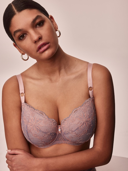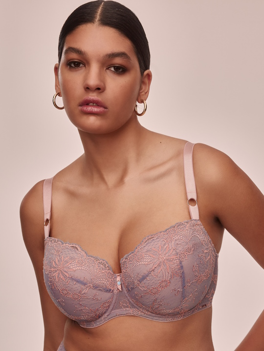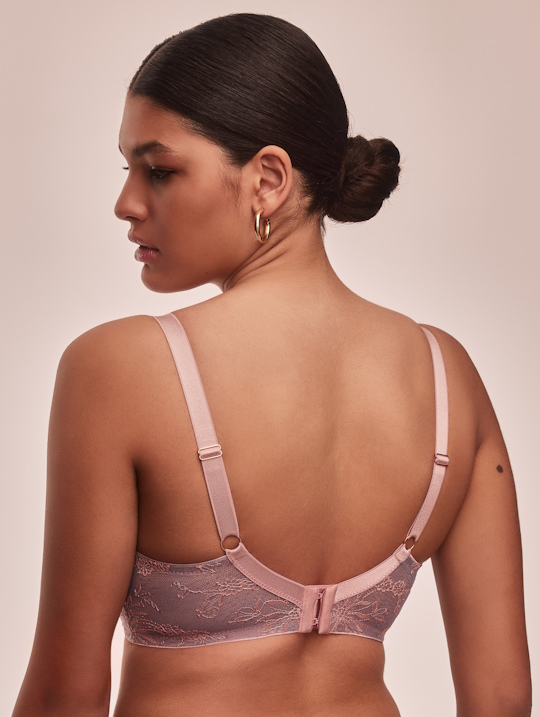 Бюстгальтер Madera U/W выполнен на основе бюста KELLY 04 U, на косточках (на каркасах), с дополнительными боковыми поддержками, чашки шитые на тонком поролоне розового цвета, со съёмными пуш-ап вкладышами, внешняя сторона чашки и спинка из роскошного сиреневого-розового кружева с цветочным узором, пояс продублирован эластичной сеткой. Бретельки не отстёгиваются, регулируются по длине. На спине застёжка на удлинитель, количество крючков в ряду застёжки, увеличивается пропорционально размеру бюстгальтера, фурнитура металлическая цвета меди. Между чашек украшение в виде подвески и атласной ленточки. Бюстгальтер идеально сочетается с трусиками Madera.