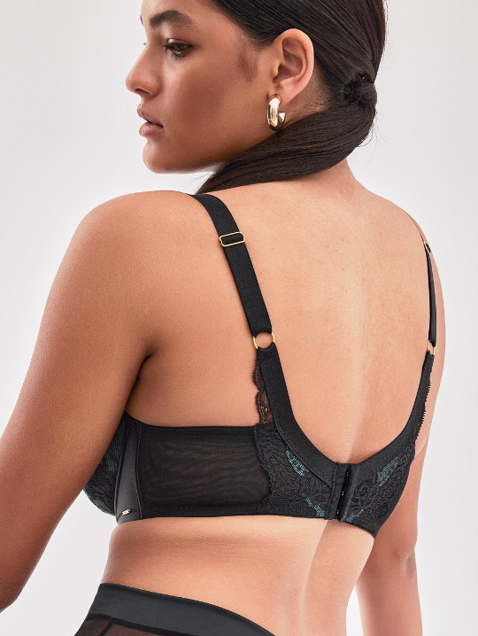 Бюстгальтер из коллекции Moon PU выполнен с чашечками на косточках, с дополнительными боковыми поддержками, чашки шитые, нижняя часть из тонкого поролона, снаружи и верхняя часть чашек из чено-зеленого кружева. Спинка из двух слоев черной сетки. Бретельки регулируются по длине, не отстёгиваются. На спине застёжка на удлинитель, количество крючков в ряду застёжки увеличивается пропорционально размеру бюстгальтера. Фурнитура металлическая цвета желтого золота. Бюстгальтер идеально сочетается с трусиками из коллекции Moon.