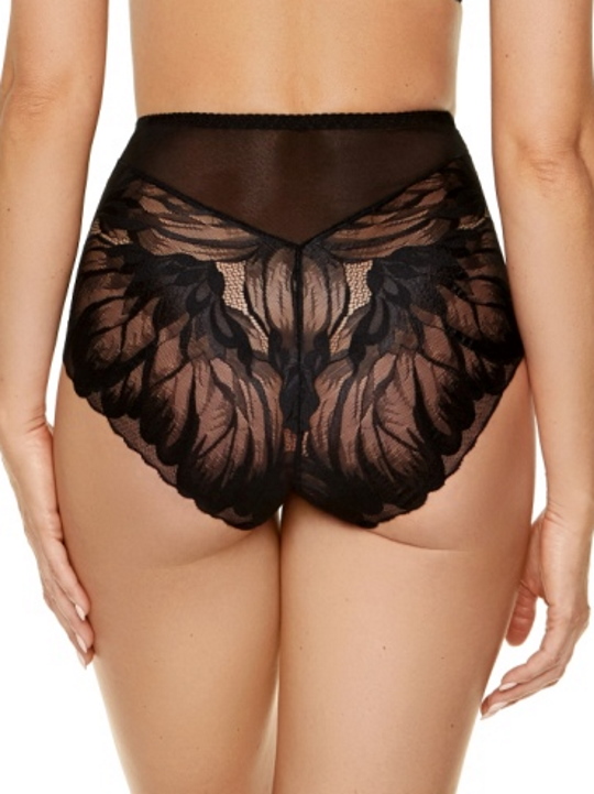 Трусики слип с высокой линией талии из коллекции Moon спереди из эластичного черно-зеленого кружевного полотна, черной сетки и атласной ткани, спинка из сетки и кружева. Ластовица из 100% хлопка. Пояс из атласной ткани. Идеально сочетаются с бюстгальтерами Moon.
