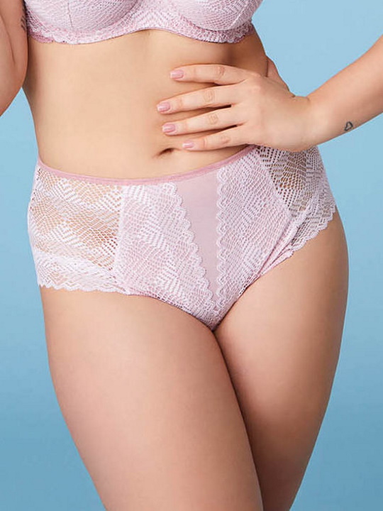 Трусики классические с высокой талией из коллекции Lior из кружевного полотна, спереди продублированы сеткой цвета пудры, на спинке V-образная вставка из сетки, декорирована кружевом. Ластовица проложена 100% хлопком.