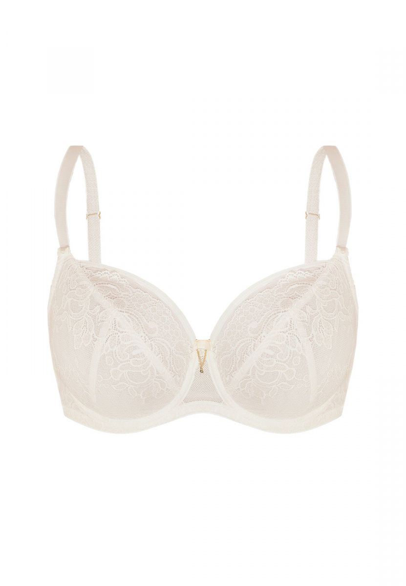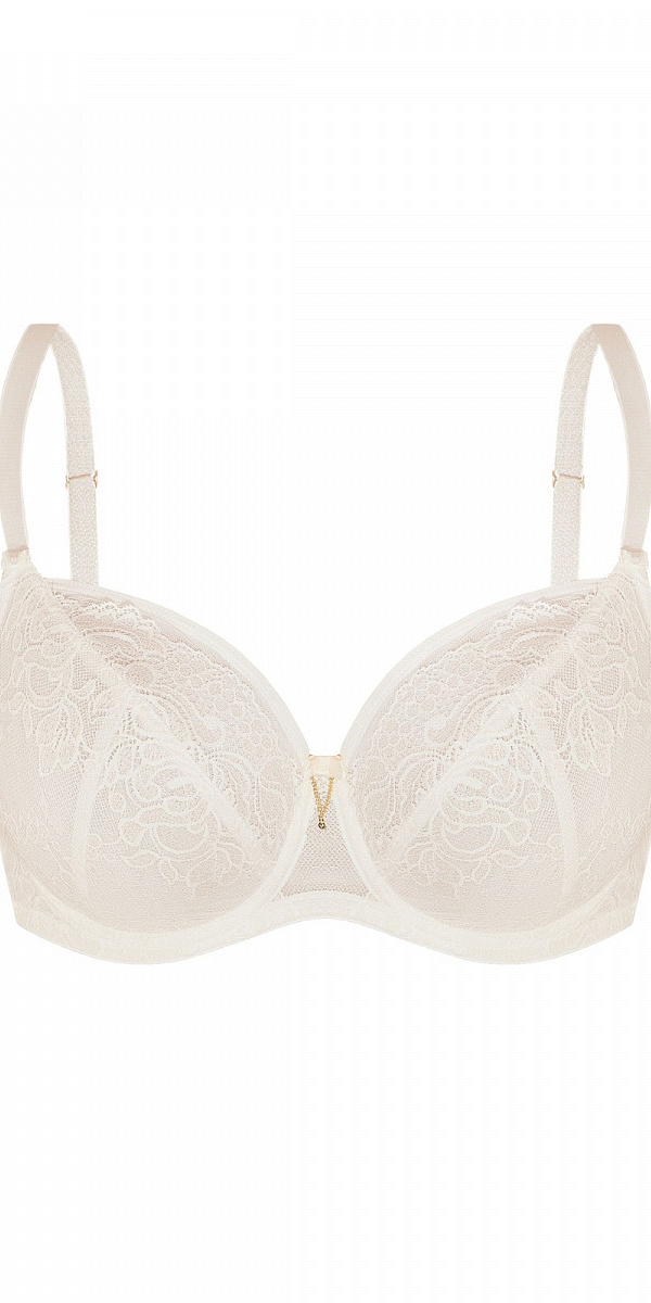 Бюстгальтер Ksenia U выполнен с шитыми поролоновыми чашками, на косточках, со съемными пуш-ап вкладышами, с дополнительными боковыми поддержками, внешняя сторона чашек из кружева, спинка из двух слоем сетки. Бретельки отстёгиваются, регулируются по длине, фурнитура металлическая цвета желтого золота. На спине застёжка на удлинитель. Бюстгальтер идеально сочетается с трусиками из коллекции Ksenia. Параметры модели бюстгальтер 70F, трусы M.