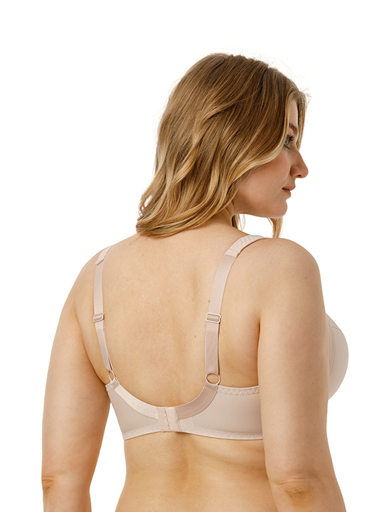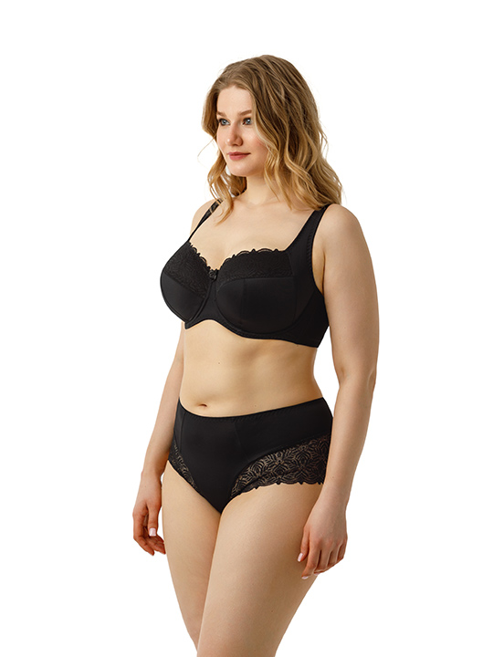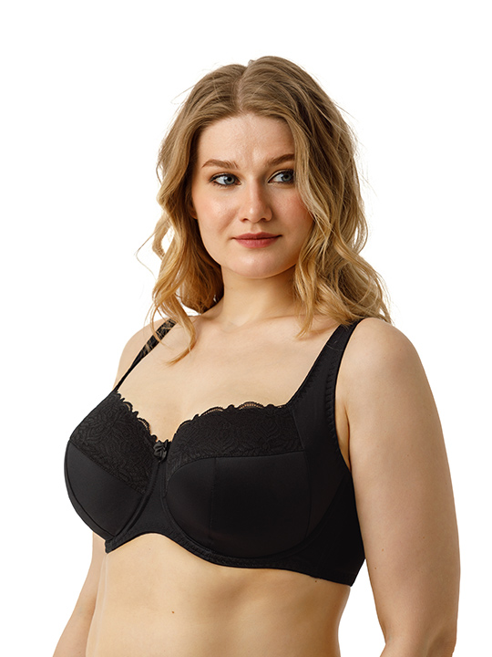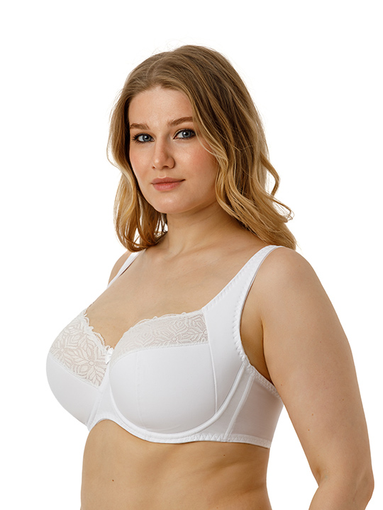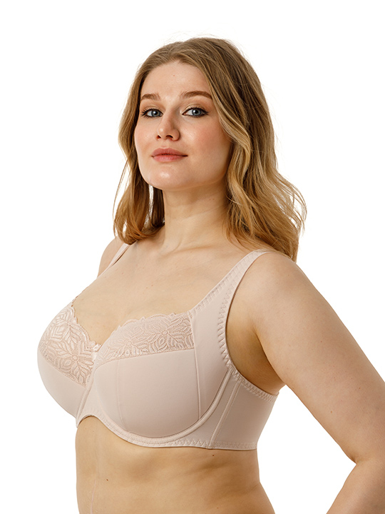 Бюстгальтер на каркасах с полудублированной чашкой. Чашки овальной формы с диагональным членением и боковым подрезом создают округлую наполненную форму и обеспечивают надёжную, высокую и комфортную поддержку груди. Усиленная бретель снимает нагрузку с плечевого пояса. Широкий стан с боковыми упругими пластинами плотно облегает тело и обеспечивает стабильную комфортную посадку бюстгальтера на фигуре