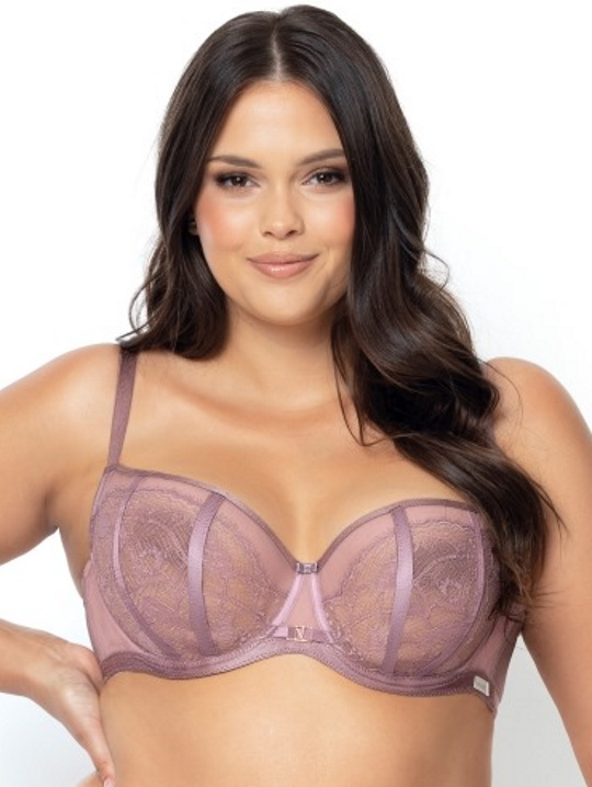 Бюстгальтер Zora M выполнен на косточках, с дополнительными боковыми поддержками, чашки мягкие, шитые из кружева, продублированы сеткой, стыковые швы декорированы атласными лентами, бретельки не отстёгиваются, регулируются по длине. Спинка из сетки. На спине застёжка на удлинитель, количество крючков в ряду застёжки увеличивается пропорционально размеру бюстгальтера. Фурнитура металлическая цвета меди. Между чашек металлическое украшение с буквой N и маленький атласный бантик. Бюстгальтер идеально сочетается с трусиками Zora.